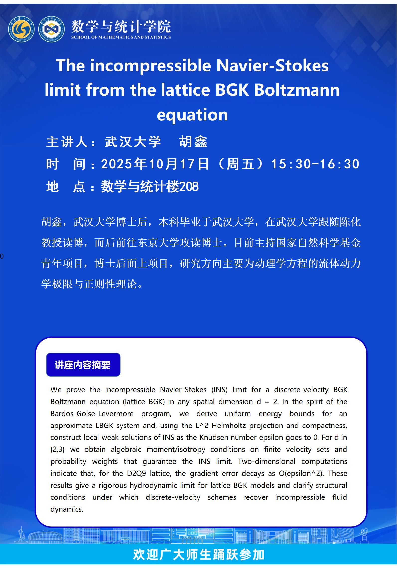 武汉大学胡鑫-The incompressible Navier-Stokes limit from the lattice BGK Boltzmann equation 发布日期:2025-10-16