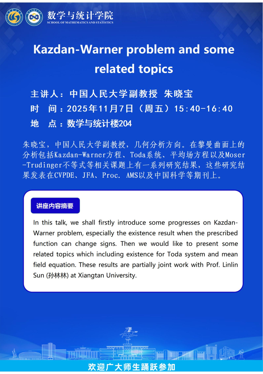 中国人民大学副教授朱晓宝-Kazdan-Warner problem and some related topics
