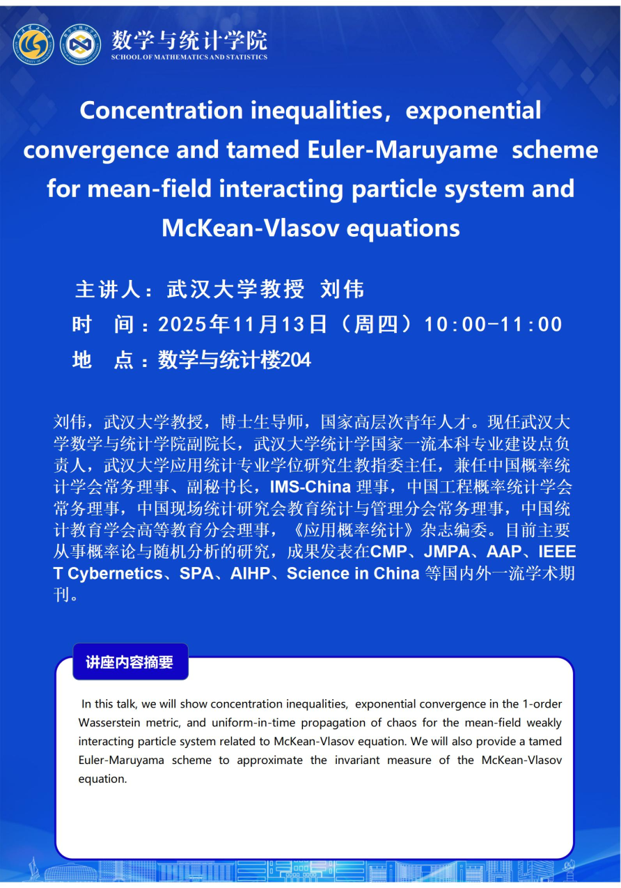 武汉大学教授刘伟-Concentration inequalities,exponential convergence and tamed Euler-Maruyame scheme for mean-field interacting particle system and McKean-Vlasov equations 发布日期:2025-11-11