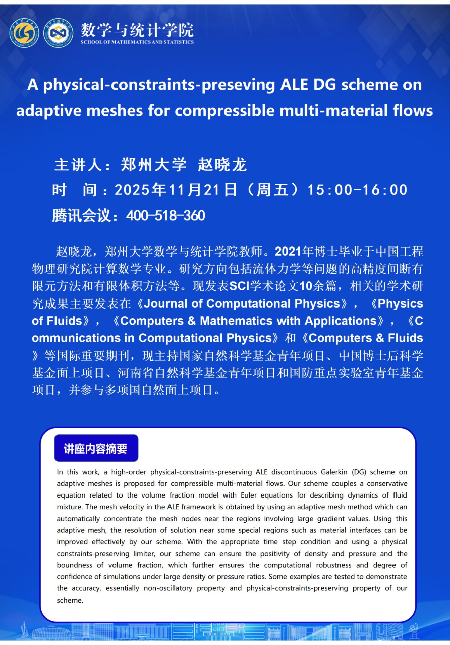 郑州大学 赵晓龙-A physical-constraints-preseving ALE DG scheme on adaptive meshes for compressible multi-material flows 发布日期:2025-11-18