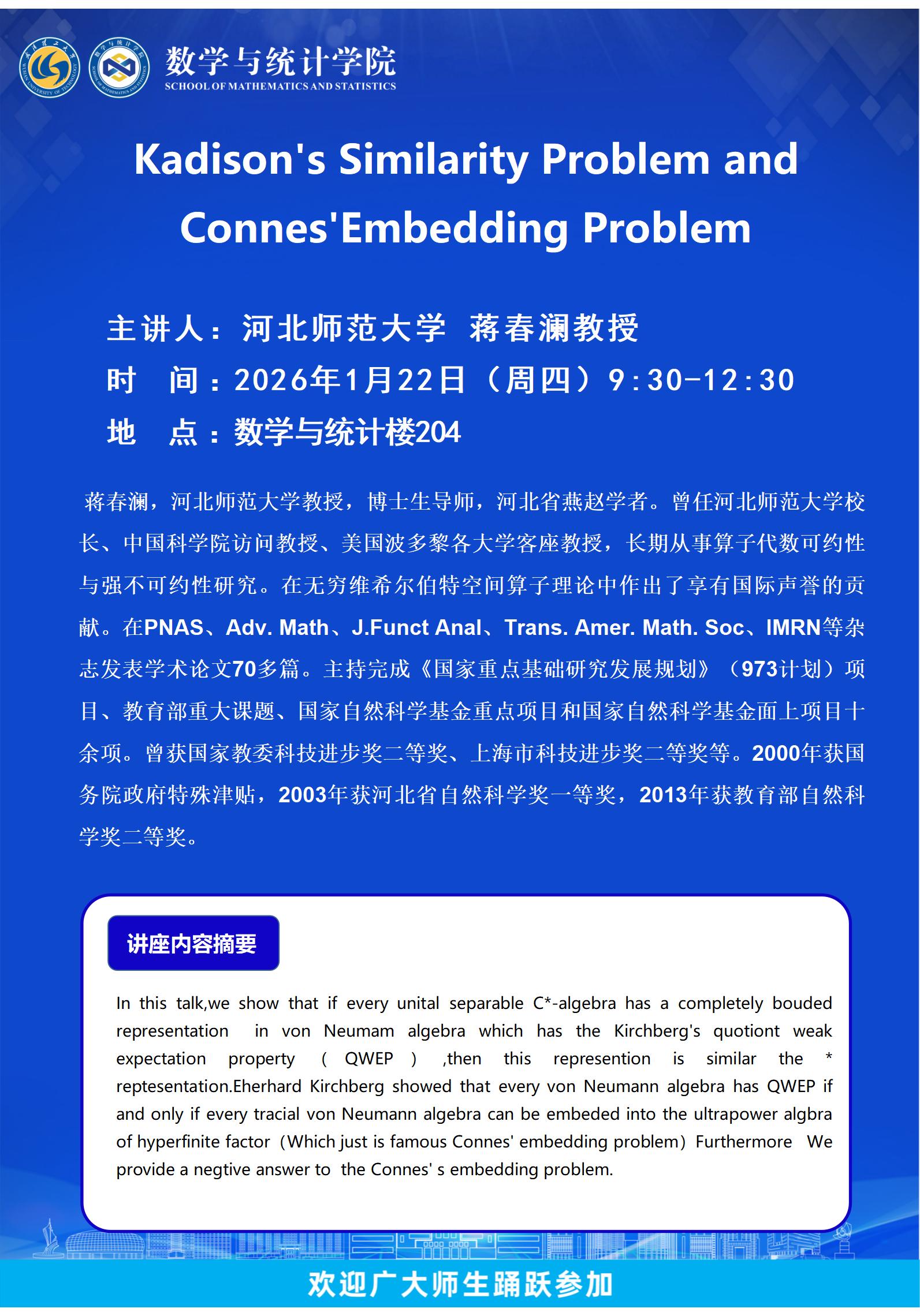 河北师范大学 蒋春澜教授-Kadison's Similarity Problem and Connes'Embedding Problem