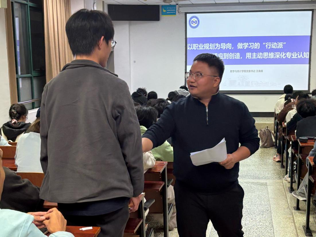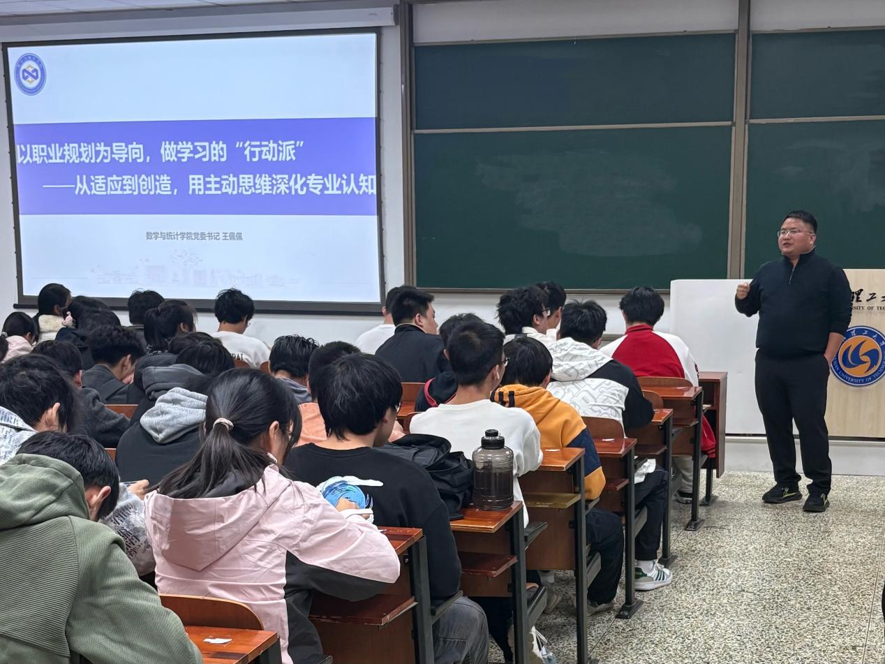 王佩佩书记结合党的二十届四中全会精神与学院走访企业的实践经验,深刻阐释了数学与统计学科的核心价值。他指出数学与统计知识已成为驱动新产业创新发展的核心动力,更是青年学子践行科技报国使命的重要支撑,鼓励同学们把个人理想融入学科学习,扎实掌握数学理论基础,真正成为思政引领下的学习 “行动派”。