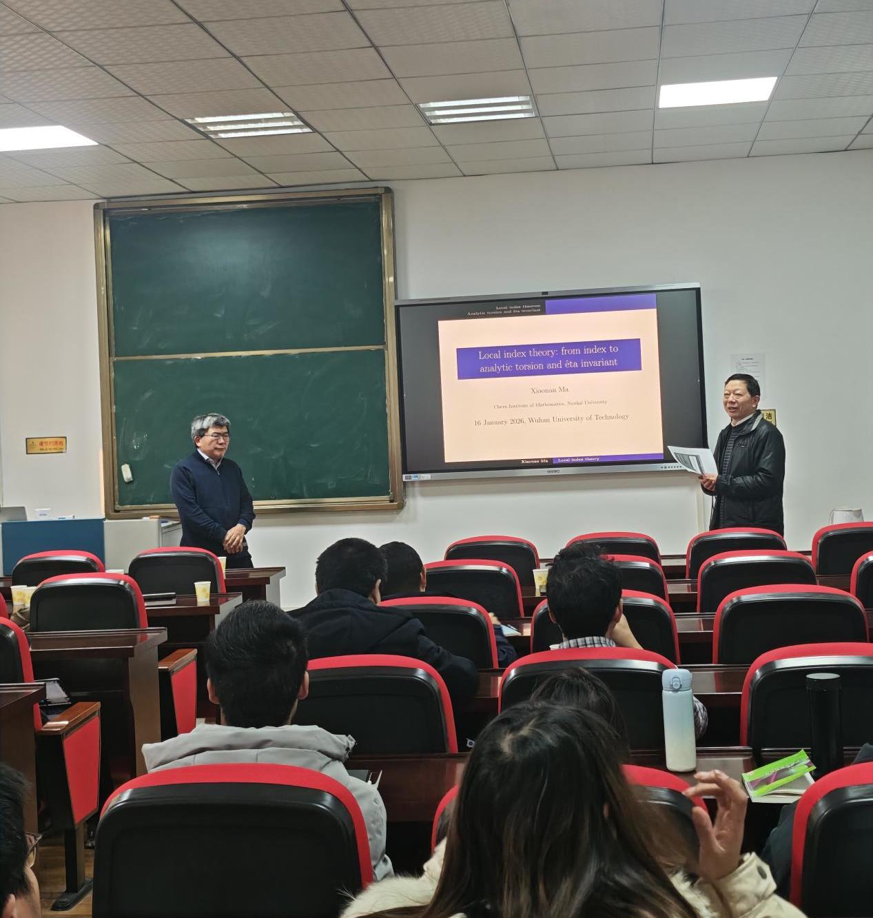 发布日期:2026-01-171月16日上午南开大学陈省身数学研究所讲席教授麻小南教授受邀作了题为“局部指标理论:从指标到解析挠率与eta不变量”的学术报告,数学系与数学中心相关老师和研究生听取了报告。