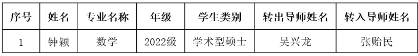 发布日期:2025-12-03依据《必赢线路检测3003研究生导师双选与转导师管理规定》(校研字〔2019〕28号)文件规定,经本人申请,转入转出导师同意,院分学位委员会审议,拟同意钟颖同学的转导申请。