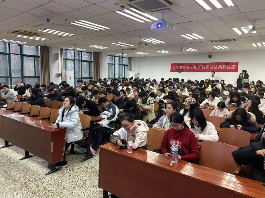 发布日期:2025-12-0812月7日,我院“校友讲堂”邀请校友企业木瓜法宝,成功举办“AI+法治”校园公益宣讲。青年律师、校友胡律师担任主讲,为全院大二学生带来一堂生动的法治课。